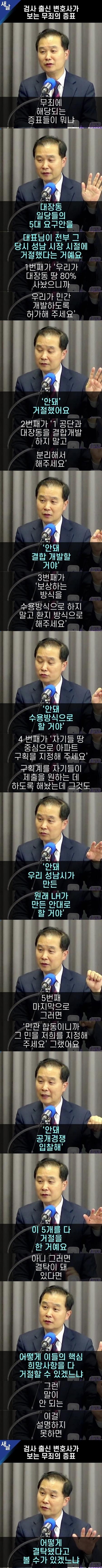 이 글은 새날 검사 출신 변호사가 보는 무죄의 증표에 대한 이야기입니다. 대장동 일당들의 5대 요구안을 대표님이 거절한 사실을 언급하고 있습니다. 1번째 요구안은 대장동 땅을 민간 개발하도록 허가해달라는 것이었고, 2번째 요구안은 대장동을 1공단과 결합개발하지 말고 분리해서 개발해달라는 것이었습니다. 3번째 요구안은 보상 방식을 수용방식으로 하도록 하고 싶었고, 4번째 요구안은 자기들이 원하는 아파트 구획을 지정해달라는 것이었습니다. 마지막으로 5번째 요구안은 민합동을 희망하는 지정희망사항을 받아들이라는 것이었습니다. 변호사는 대표님이 이 모든 요구를 거절했다면 무죄의 증이라고 말하고 있습니다. 추천을 원한다고 합니다.