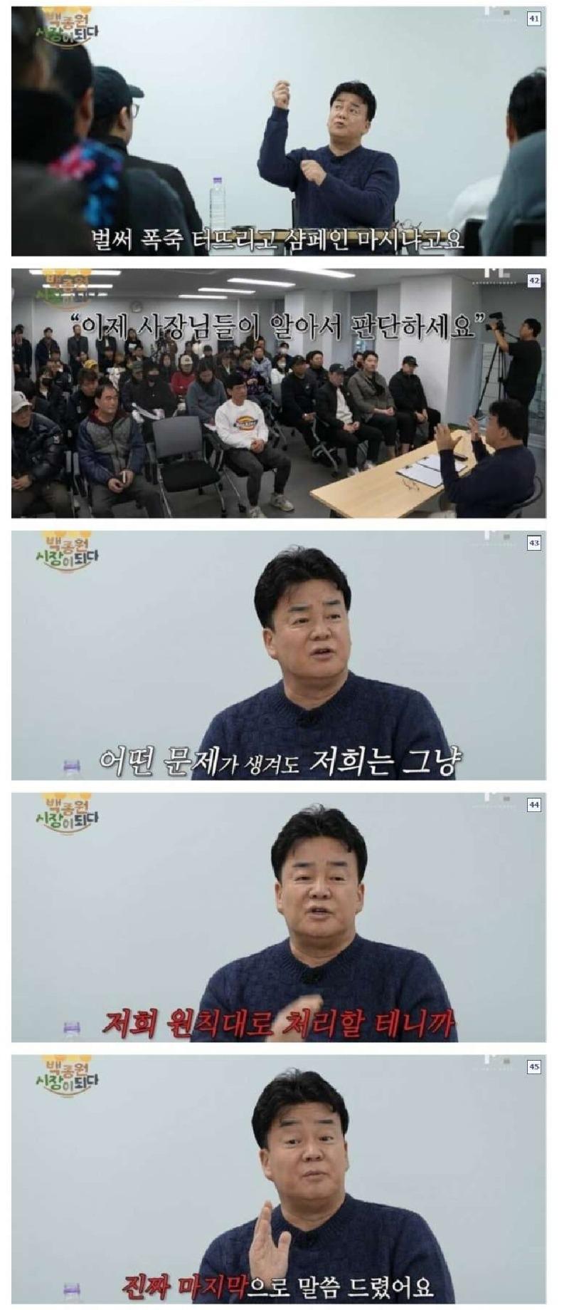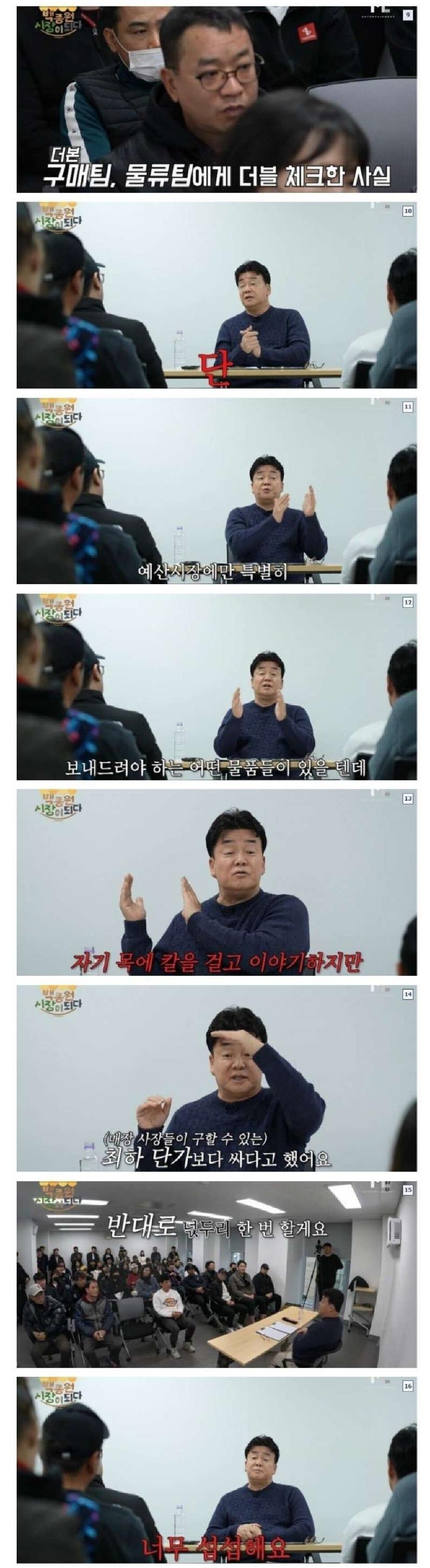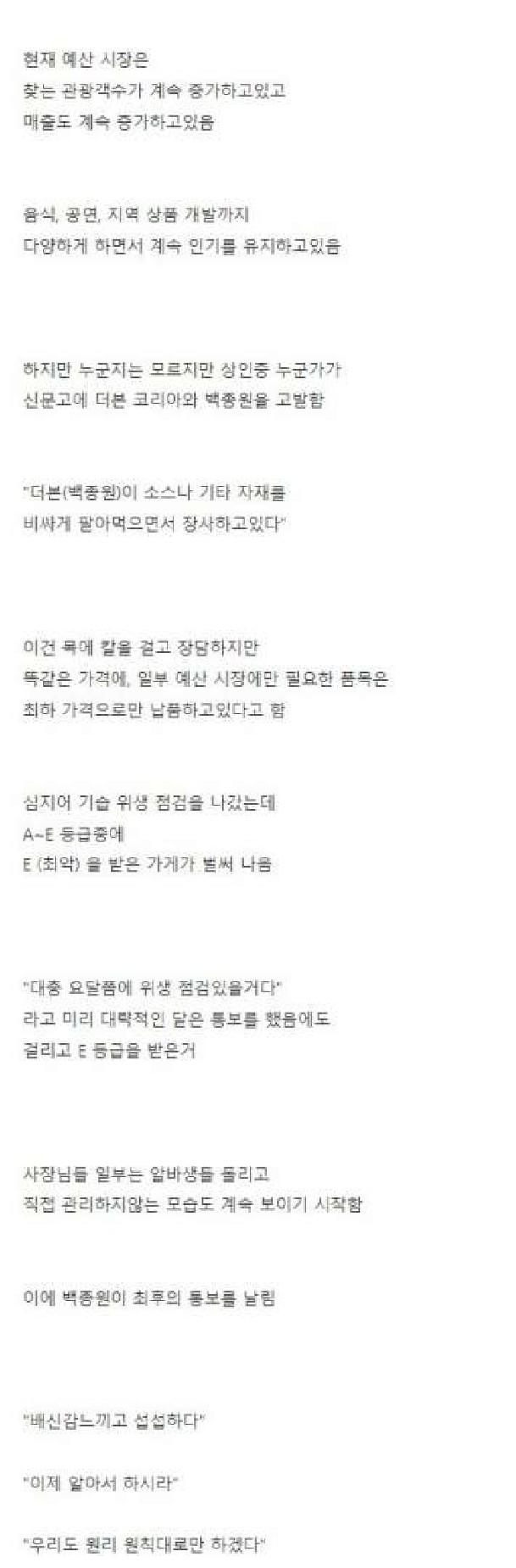 원들에게 백종원 시장의 불만을 담은 글이 국민신문고에 올려졌다. 이 글에 따르면, 백종원 시장은 TAGRAMS에서 소스 및 공급제품을 강제로 비싸게 판다고 주장하고 있다. 그는 MH 동원 시장으로부터 어떤 물품들이 배로 보내져야 한다고 요구받았다. 더블 체크하는 사실을 알게 된 Angi는 백종원 시장이 배로 보내야 하는 물품에 대해 물류팀에게 문의한다. 그러나 Angi는 백종원 시장이 되는 대신 백원 시장이 되는 동원 장이며, 이로 인해 프랜차이즈 가맹점을 늘리는 것이 가능할 것이라고 제안하고 있다. 동원 장은 매장 사장들이 구할 수 있는 최하 단가보다 더 싸다고 주장하고 있으며, 해당 글을 남긴 사람은 소스를 개발했을 때 백종원 시장이 그것을 팔아먹었다고 불만을 토로하고 있다. 더불어 백종원 시장을 배신자로 보고 있으며, 돈을 벌기 위해 일부 공산품과 완제품을 판다고 주장하고 있다. 이에 대해 백종원 시장은 예산 시장에서만 특별한 대우를 받는다며 죄송한 마음을 표하고 있다. 그는 또한 자신의 입장에서는 배신감을 느끼고 있으며, 더브코리아 브랜드 가맹점과 백종원 직영점을 늘리기 위해 백조원 직원을 채용하겠다고 약속했다. 마지막으로 그는 고용 창출에 대해 감사한 마음을 표하면서 일부 사장들이 자리를 차지하지 못하고 있는 것은 감당하기 힘든 일이라고 강조하고 있다.