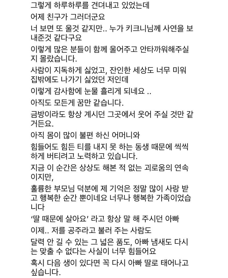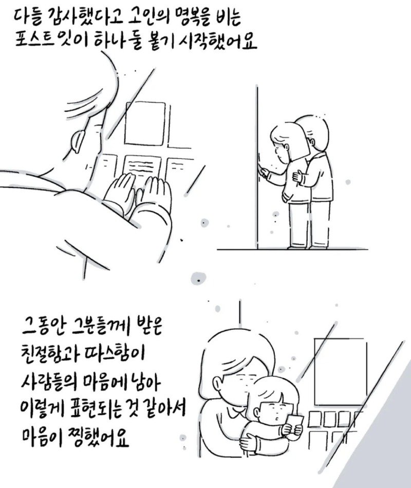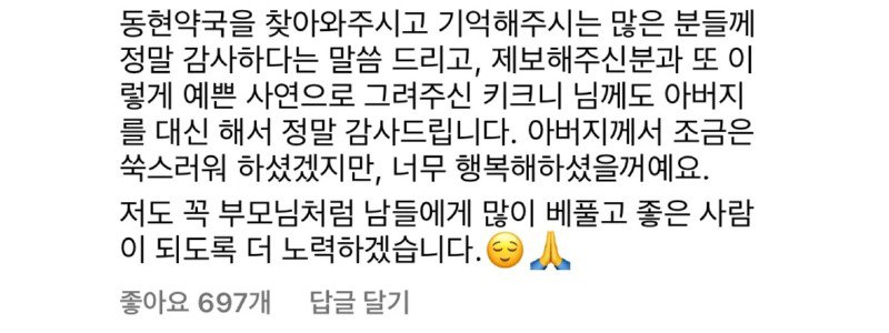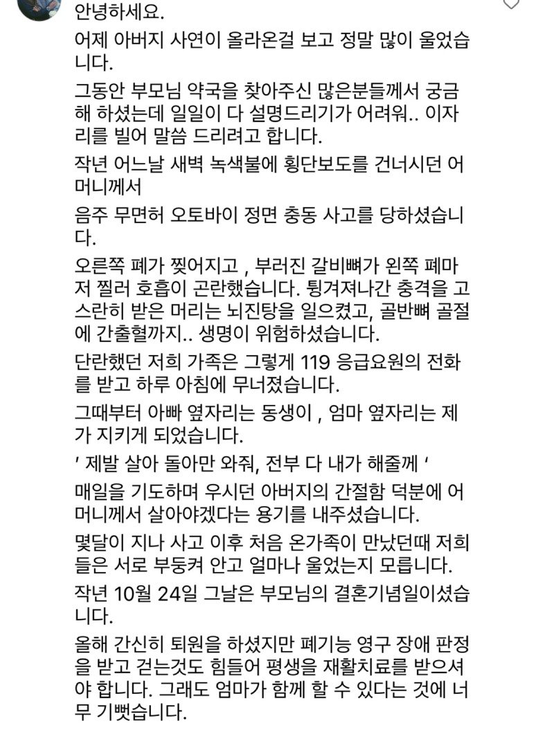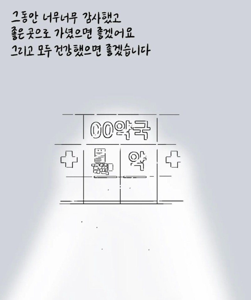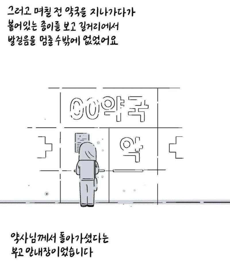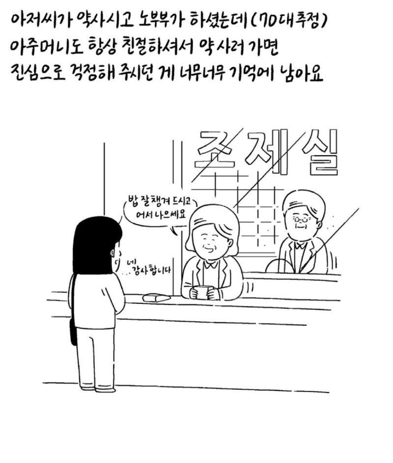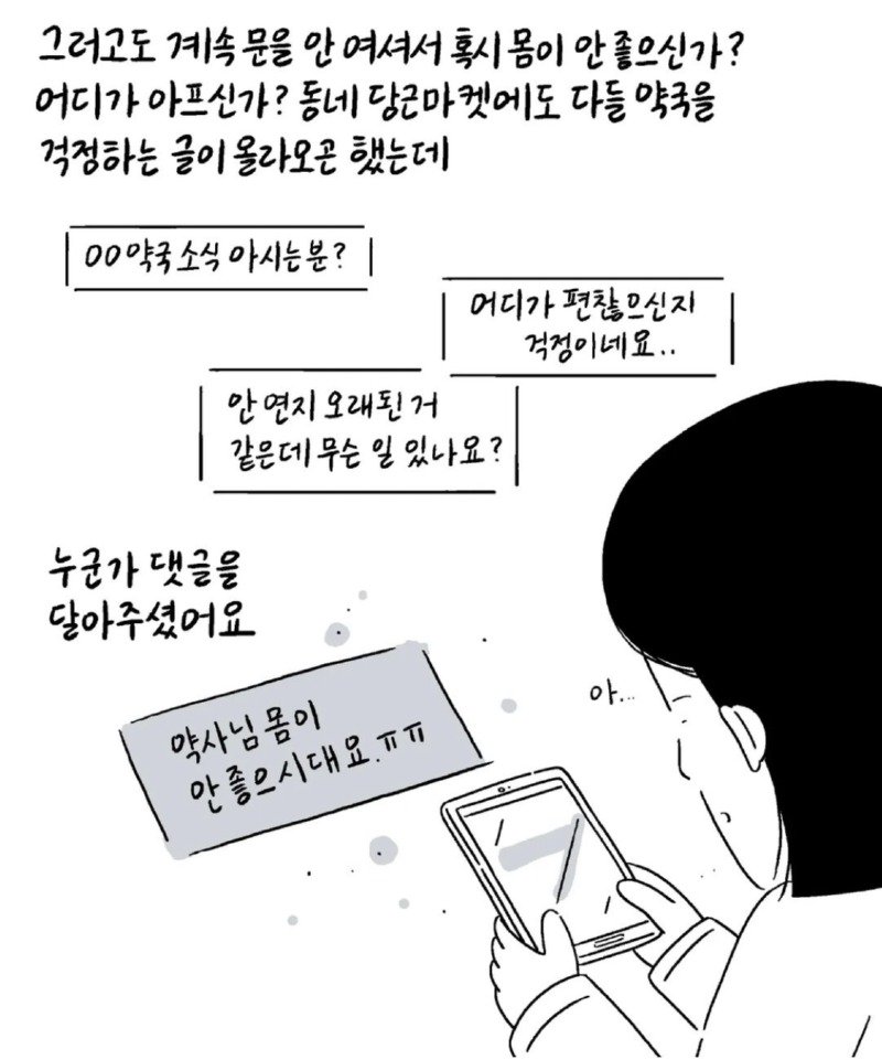 우리 동네에는 옛날부터 오랫동안 운영되는 한 약국이 있었습니다. 그 약국은 항상 문을 여는 일찍 문을 닫는 늦은 시간까지 불을 밝히는 약국이었습니다. 약사 아저씨와 노부부 (추정 70대)가 운영하고 있는데, 아줌마도 항상 친절해서 처음 약국을 방문할 때부터 진심으로 걱정해 주셨습니다. 어느 날부터 약 1달 넘게 문을 여는 것을 보지 못해서 약국에는 개인 사정으로 당분간 문을 닫게 된다는 글이 붙어 있었습니다. 그런데 최근 며칠 동안 약국이 여전히 문을 닫아 누구나 약국을 걱정하며 댓글을 달기도 했습니다. 보고 싶다고 인사하며 계속해서 약국 문을 열지 않는 것을 보니 혹시 몸이 안 좋으신 건가요? 어디가 아프신 건가요? 동네 당근마켓에도 약국 소식을 아시는 분 계신가요? 안녕하세요 다들 좋은 아침입니다. 약사님께서 돌아가셨다는 소식을 들었습니다. 그러고도 며칠 전 약국을 지나가다가 붙어 있는 종이를 보고 길을 멈출 수밖에 없었습니다. 그리고 그 다음 날 약국을 지나가는데...정말 좋은 사람들이 없으신가요? 약사님 몸이 안 좋으시다니 너무나 가슴이 아픕니다. 이렇게 표현하는 것 마냥 마음이 찡해집니다. 감사합니다. 밥을 잘 챙겨드시고 어서 나으세요. 따스함이 전해지는 00 약국이 어떤 곳인지 눈물이 나오네요. 좋은 곳에 가셔서 편히 쉬세요. 2015년 3월 5일, 그 아주머니도 건강을 잘 챙기셨으면 좋았을 텐데...아마 굽은다리역 주변 주민들 모두 한 마음일 것 같습니다. 이제는 켜진 약국을 볼 수 없게 되는 것이 아쉽습니다. 지나갈 때마다 마음이 아픕니다. 안녕하세요 어르신~ 기조제실 그동안 너무너무 감사했고 안녕하세요 좋은 곳으로 가셔서 건강하고 행복했으면 좋겠습니다. 모두 시원한 하루 보내세요.