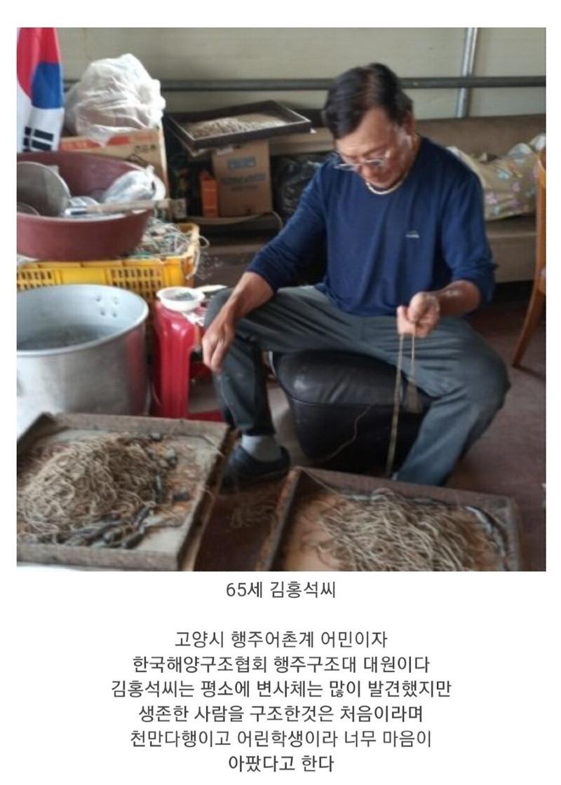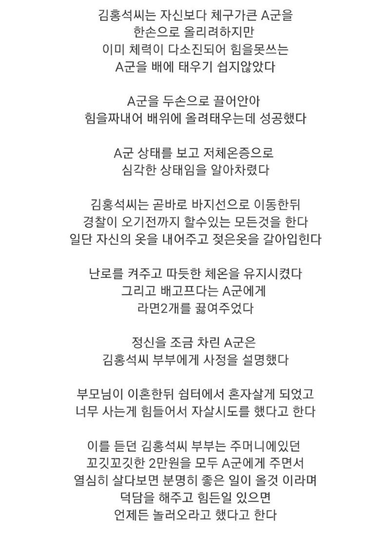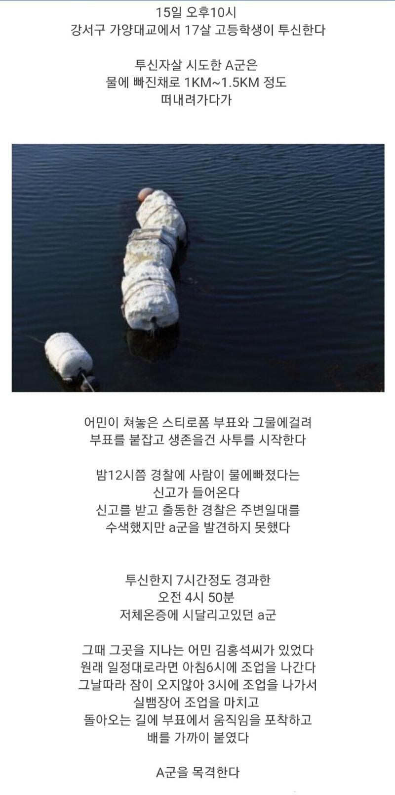 15일 오후 10시, 강서구 가양대교에서 17살 고등학생이 투신하려고 했습니다. 투신자살을 시도한 A군은 물에 빠져 1KM~1.5KM 정도를 떠내려갔지만, 어민들이 쳐놓은 스티로폼 부표와 그물에 걸려 부표를 붙잡고 생존을 위한 사투를 벌이게 되었습니다. 밤 12시경, 경찰에 사람이 물에 빠졌다는 신고가 들어왔고, 출동한 경찰은 주변을 수색했지만 A군을 찾지 못했습니다. 투신 후 약 7시간이 지난 오전 4시 50분, 저체온증에 시달리고 있는 A군의 모습을 발견한 어민 김홍석씨가 있었습니다. 원래는 아침 6시에 조업을 시작하려고 했으나 잠이 오지 않아 3시에 조업을 시작한 김홍석씨는 실뱀장어를 잡고 돌아오던 중에 부표에서 움직임을 포착하고 배를 가까이 다가갔습니다. 김홍석씨는 자신보다 체구가 큰 A군을 한손으로 올리려 했지만 이미 체력이 다소진된 A군을 배에 태우는 것이 어려웠습니다. 그러나 두 손으로 A군을 끌어안아 힘을 내어 배 위로 올려탔고, A군의 상태를 보고 저체온증으로 심각한 상태라는 것을 알아차렸습니다. 김홍석씨는 곧바로 바지선으로 이동한 후, 경찰이 도착하기 전까지 할 수 있는 모든 조치를 취했습니다. 먼저 자신의 옷을 내어주고 젖은 옷을 갈아입혀주었고, 난로를 켜 따뜻한 체온을 유지시켜주었습니다. 그리고 배고픔을 호소하는 A군에게 라면 2개를 끓여주었습니다. 이제 조금 정신이 차린 A군은 김홍석씨 부부에게 어려운 상황을 설명했습니다. A군은 부모님이 이혼한 뒤 쉼터에서 혼자 생활하게 되었고, 너무 어려워서 자살을 시도했다고 말했습니다. 이를 듣고 김홍석씨 부부는 주머니에 있던 꼬깃꼬깃한 2만원을 모두 A군에게 주며, 열심히 살면 분명히 좋은 일이 올 것이라고 격려해주었습니다. 또한, 힘들 때는 언제든지 놀러오라고도 했다고 합니다. 김홍석씨는 65세로서 고양시 행주어촌계 어민이자 한국해양구조협회 행주구조대 대원으로 활동하고 있는데, 변사체는 많이 발견했지만 생존한 사람을 구조한 것은 이번이 처음이라고 합니다. 김홍석씨는 천만다행하다며 어린 학생이라 마음이 아팠다고 말했습니다.