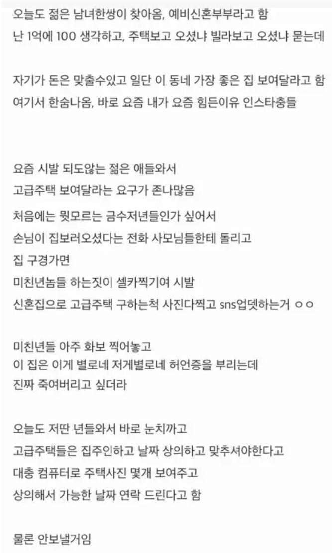오늘은 예비신혼부부가 찾아왔다. 그들은 젊은 남녀 한 쌍이었고, 주택을 찾으려고 했다. 그들은 돈이 맞다고 하고 좋은 집을 보여달라고 요구했다. 나는 한숨을 내쉬었다. 최근에는 젊은 인스타그램 중독자들이 너무 많아서 짜증이 난다. 젊은 사람들이 찾아와서 고급주택을 보고 싶다고 요구하는 것은 정말 황당하다. 처음에는 그들이 부유한 사람들인가 싶었지만, 집 구경을 가는 동안 그들이 그냥 사진을 찍고 SNS에 올리는 것을 보니까 미친년들이었다. 정말 화들짝 놀랐다. 이런 사람들을 보면 진짜로 죽이고 싶어진다. 오늘도 그런 여자들이 와서 내가 눈치를 줬는데, 고급주택을 보려고 하는 사람들은 집주인과 일정을 맞춰야 한다고 대충 컴퓨터로 몇 개의 주택 사진을 보여주고 가능한 날짜에 연락을 드릴 것이라고 했다. 물론 난 그런 사람들에게는 보내지 않을 것이다.