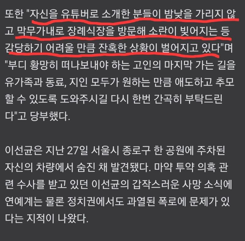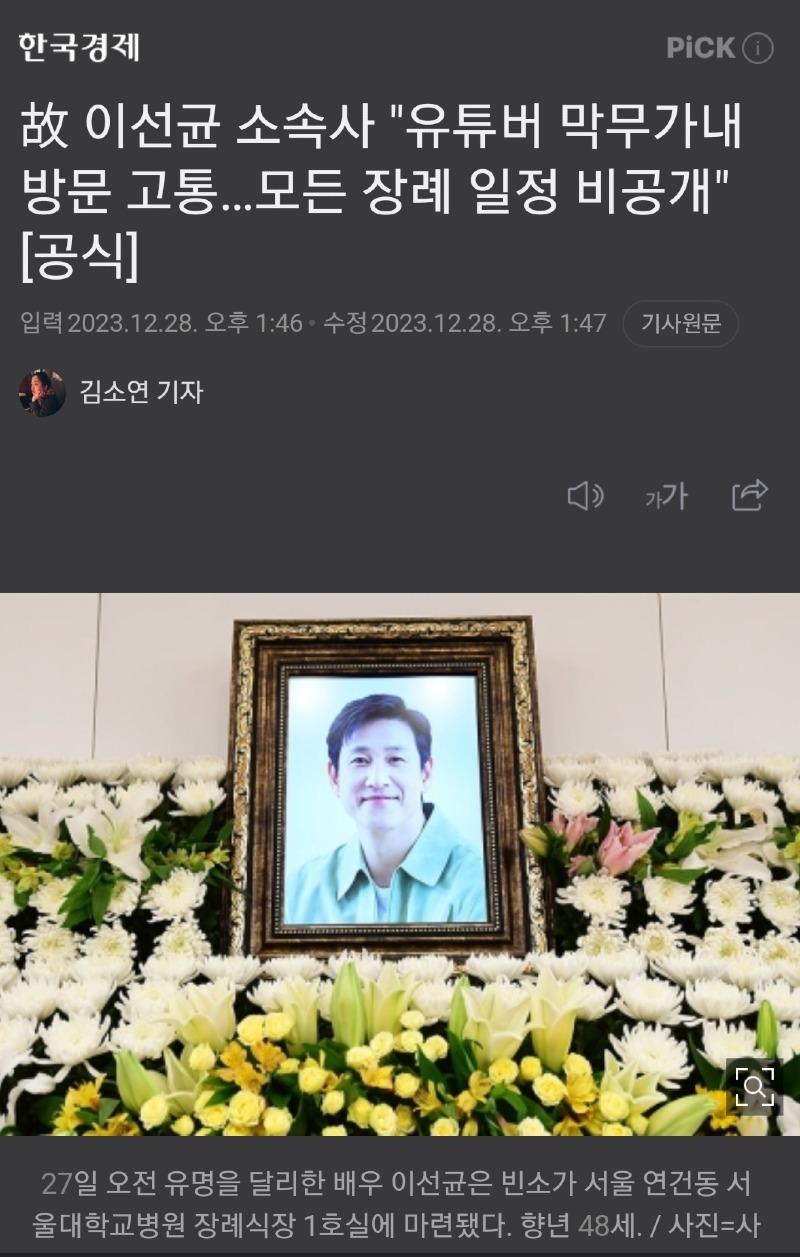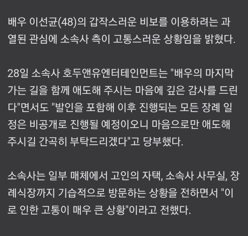 한국 경제, 이선균 소속사인 호두앤유엔터테인먼트는 이선균의 장례 일정이 비공개로 진행될 예정이라고 밝혔다. 이선균의 빈소는 서울 연건동에 위치한 서울대학교병원 장례식장 1호실에 마련되었다. 이선균은 48세로 향년하였다. 소속사는 이번 상황으로 인해 고통을 받고 있다고 전했으며, 매체에서는 이선균의 자택, 소속사 사무실, 장례식장 등을 기습적으로 방문하는 상황이 발생하고 있어 상황이 매우 심각하다고 전했다. 소속사는 이에 대해 유튜버로 자신을 소개한 사람들이 장례식장을 막무가내로 방문하여 소란을 일으키는 등의 문제가 발생하고 있다며, 이로 인해 고인의 마지막 가는 길을 충분히 애도할 수 있도록 도와달라고 부탁했다. 이선균은 지난 27일 자신의 차량에서 숨진 채 발견되었으며, 현재 마약 투약 의혹 관련 수사가 진행 중이다. 이로 인해 연예계뿐만 아니라 정치권에서도 과열된 폭로에 문제가 있다는 지적이 나와 논란이 되고 있다.